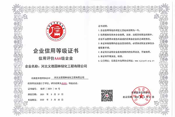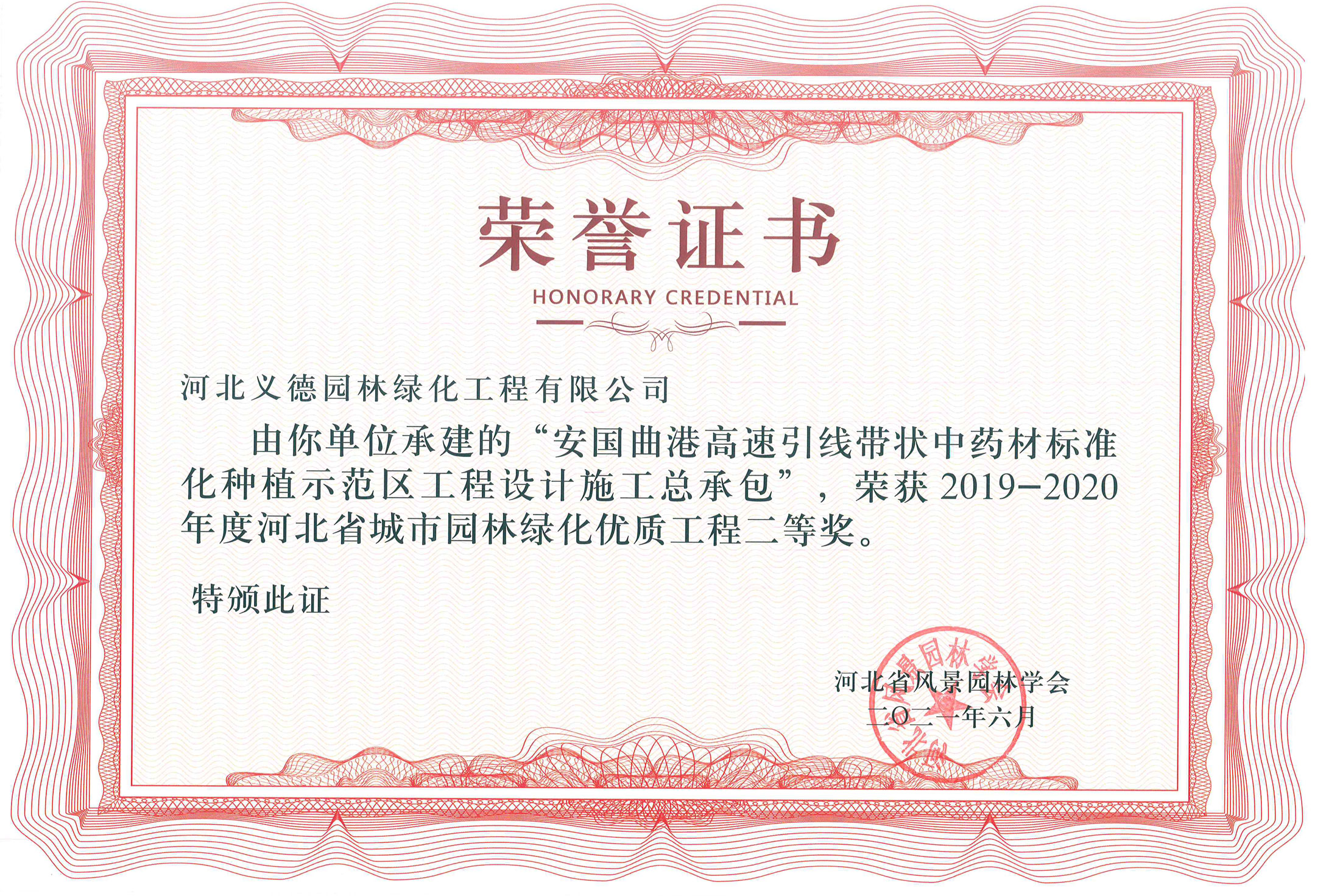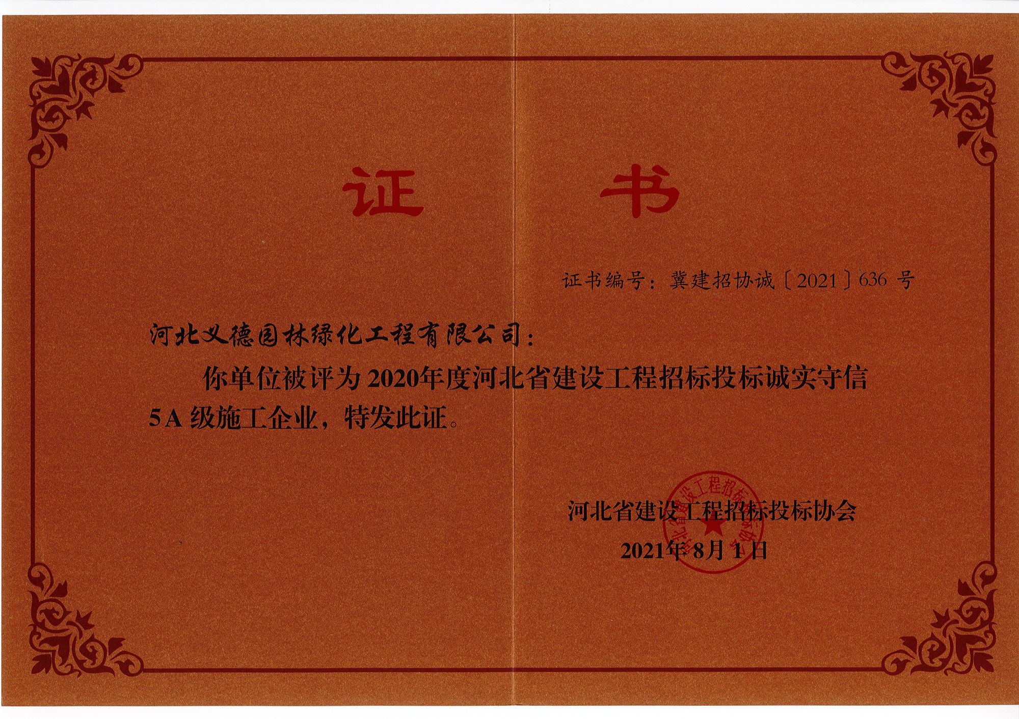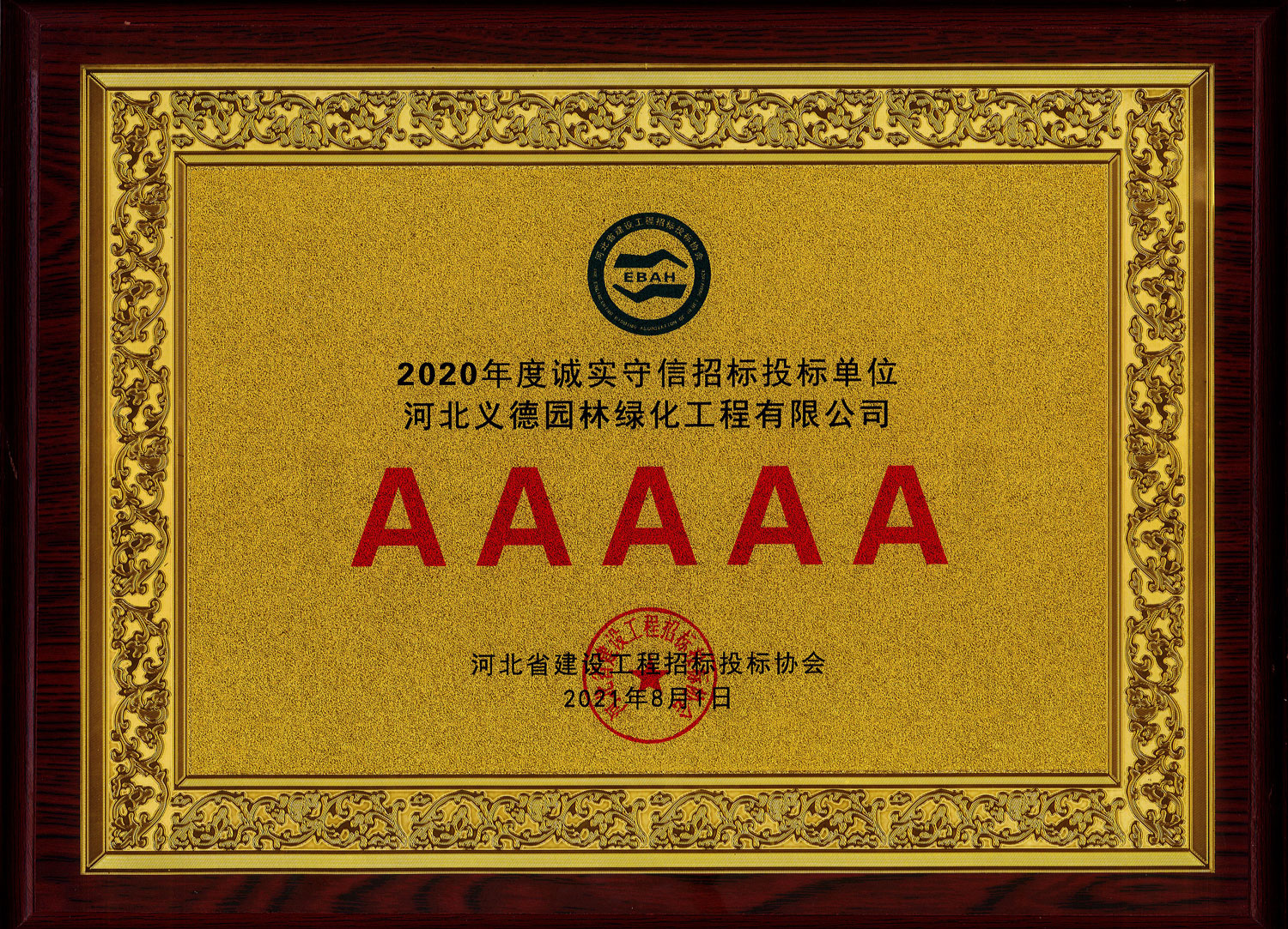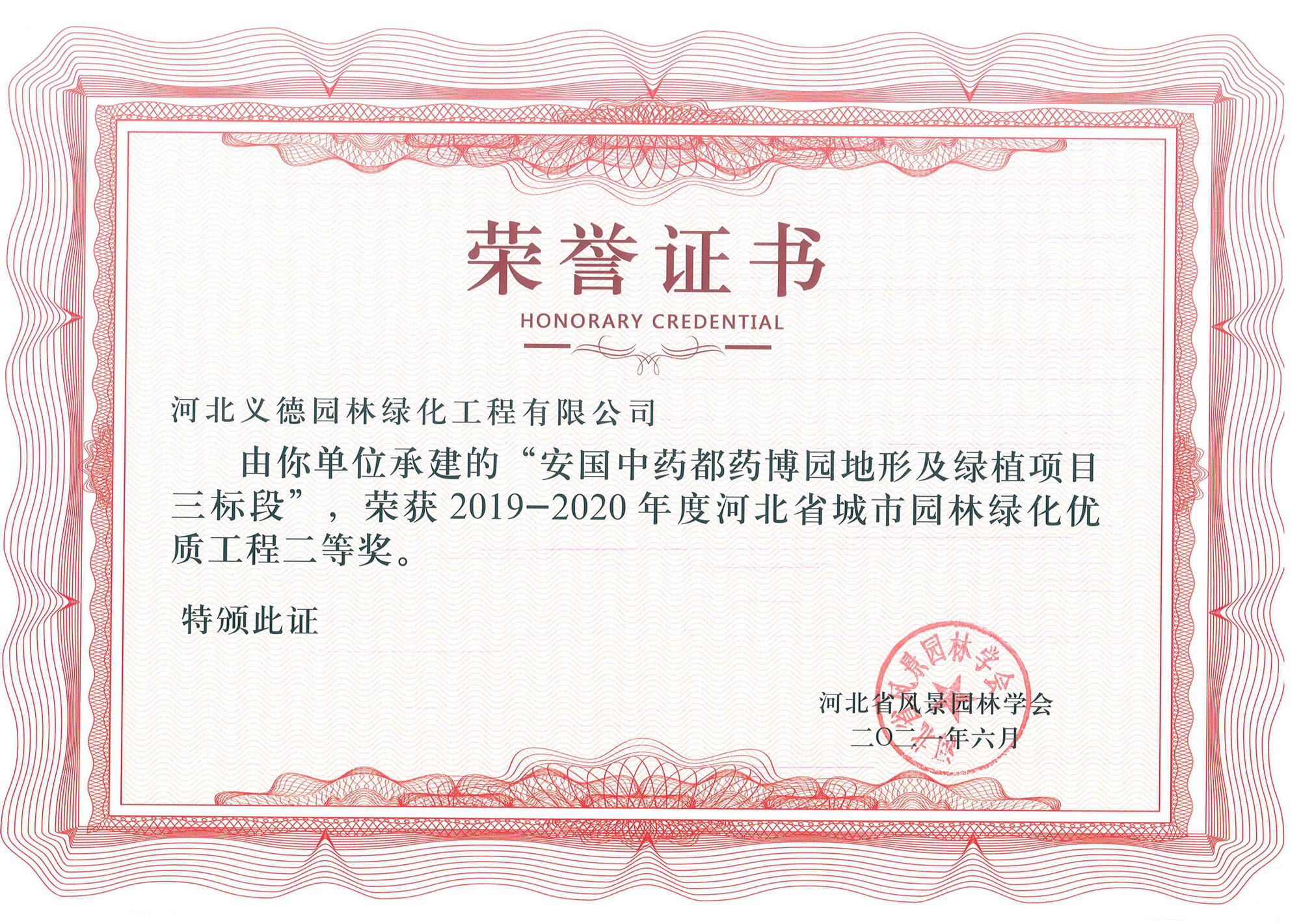 近幾年來我公司被授予2019年-2022年河北省扶貧龍頭企業(yè)、2018年國家林業(yè)標(biāo)準(zhǔn)化示范企業(yè)、2019年度全國苗圃50強(qiáng)、2018-2019年度河北省林業(yè)重點(diǎn)龍頭企業(yè)、2018年保定市精品特色現(xiàn)代農(nóng)業(yè)園區(qū)、2018年度保定林木種苗協(xié)會授予特色苗圃、2018年度北方十佳特色苗圃、2016-2019年河北省建設(shè)工程招標(biāo)投標(biāo)誠實守信5A級施工企業(yè)等榮譽(yù)稱號,2017年保定市林木種苗龍頭企業(yè)、石家莊市2017年度優(yōu)秀園林企業(yè)。