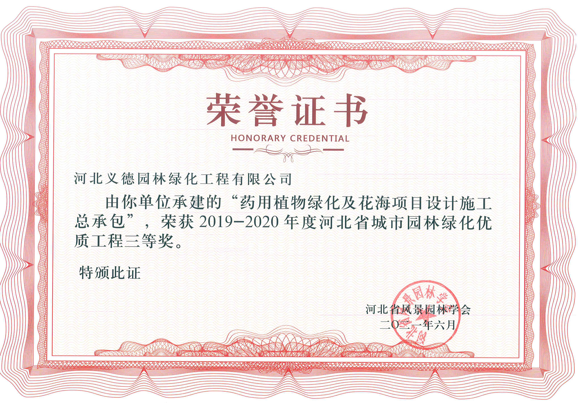 工程業(yè)績榮獲有2017-2018年度河北省城市園林綠化優(yōu)質(zhì)工程二等獎兩個;2019-2020年度河北省城市園林綠化優(yōu)質(zhì)工程二等獎兩個、三等獎兩個;2018至2020年保定市燕趙杯優(yōu)質(zhì)工程五個;2020年度石家莊市優(yōu)質(zhì)工程一個。